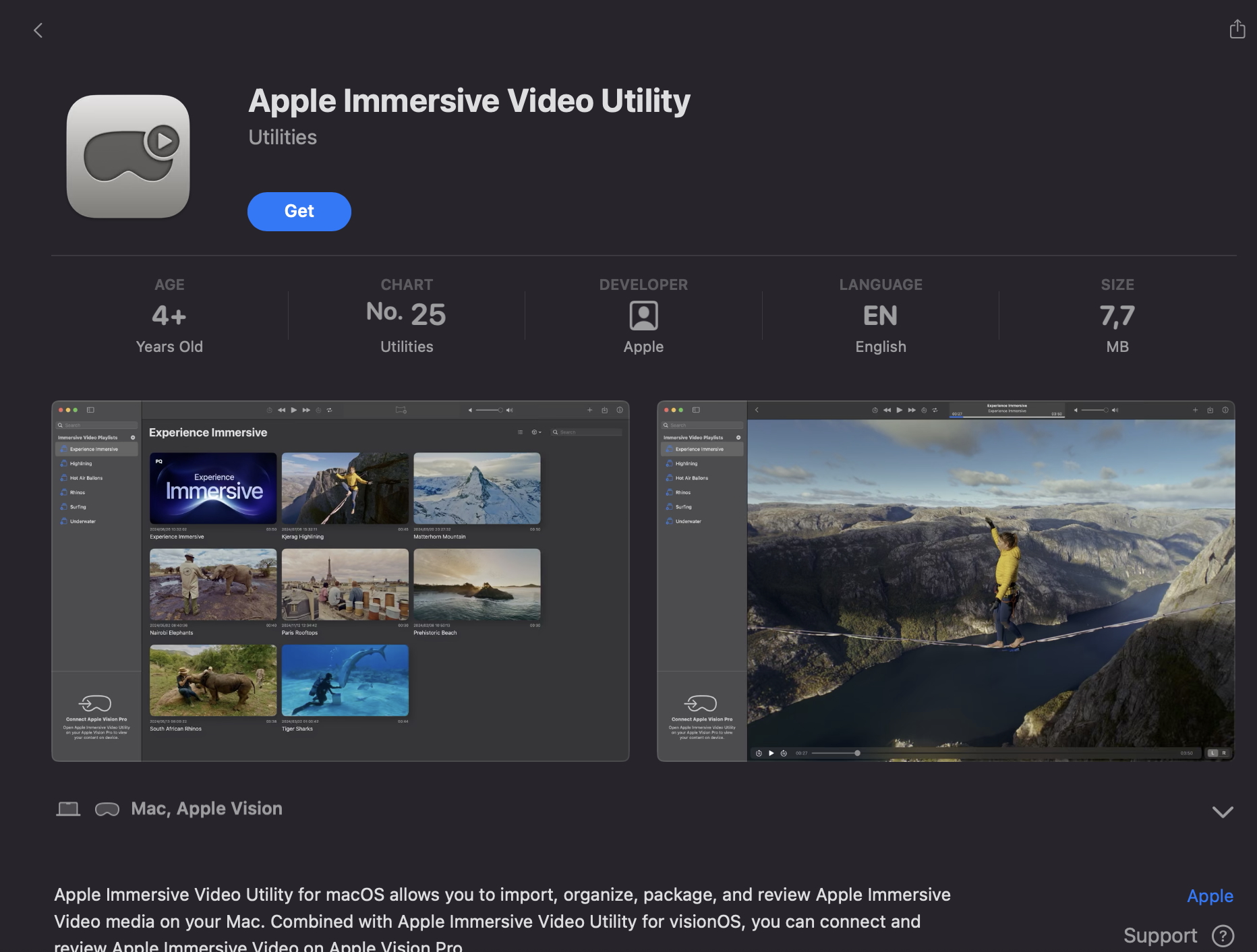 Apple vừa phát hành ứng dụng Apple Immersive Video Utility, dành cho cả macOS và visionOS, một năm sau khi ra mắt Apple Vision Pro. Ứng dụng này cho phép người dùng quản lý và xem lại các tệp spatial video (video 3D) trên Mac, đồng thời kết nối với một hoặc nhiều thiết bị Vision Pro để xem nội dung. Một tính năng nổi bật là khả năng phát đồng bộ cho nhiều thiết bị Vision Pro, phù hợp cho các buổi xem nhóm. Ứng dụng hiện chỉ hỗ trợ tiếng Anh (Mỹ) và yêu cầu Mac có chip M1 trở lên chạy macOS Sequoia.