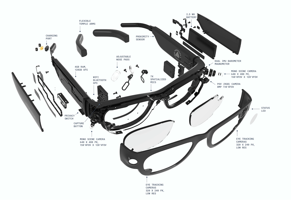 Xét về khía cạnh ngoại hình, Project Aria không sexy như Meta x Ray-ban hay nhiều mẫu kính thông minh khác, mục đích chính của chiếc kính này là để thu thập dữ liệu. Project Aria được trang bị hàng loạt các cảm biến phục vụ cho nhu cầu này chẳng hạn như camera đôi, microphones array hay thậm chí là camera dành riêng để theo dõi chuyển động của mắt. Có thể ví chiếc kính này như những chiếc xe hơi chuyên dụng của Google hay Vinfast chuyên chạy ngoài đường để thu thập dữ liệu đường phố cho máy học, tuy rằng mục đích của Project Aria có thể nói là rộng hơn.