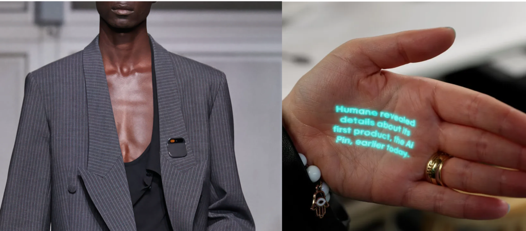 Một cách tiếp cận độc đáo với thiết bị đeo trợ lý AI là Humane Ai Pin, một thiết bị có thể gắn trên trang phục của bạn. Nó lớn hơn một chút so với một chiếc ghim cài áo thông thường, nhưng được tích hợp đầy đủ camera, micro, loa và một máy chiếu laser sáng tạo, được thiết kế để chiếu thông tin lên lòng bàn tay của người dùng khi bàn tay đặt trước thiết bị. Đây là một trong những thiết bị AI theo thời gian thực đầu tiên dưới dạng standalone (không đòi hỏi kết nối với điện thoại), một trong những ưu điểm nổi bật so với các sản phẩm khác trên thị trường. Trong một buổi thuyết trình TEDTalk của Imran Chaudhri, người sáng lập Humane và cựu nhà thiết kế của Apple, thiết bị này đã thể hiện các khả năng của mình. Ví dụ, Chaudhri đặt một thanh kẹo trước thiết bị và hỏi liệu đó có phải là một lựa chọn lành mạnh hay không. Thiết bị đã quét thông tin của thanh kẹo, đối chiếu với dữ liệu cá nhân của anh ấy và cung cấp một câu trả lời chu đáo.