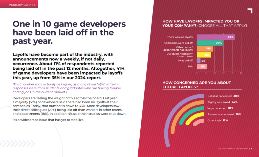 Một thống kê về tỉ lệ nhà phát triển game đã bị sa thải trong năm qua | Ảnh: GDC 2025 State of the Industry report – Page 9