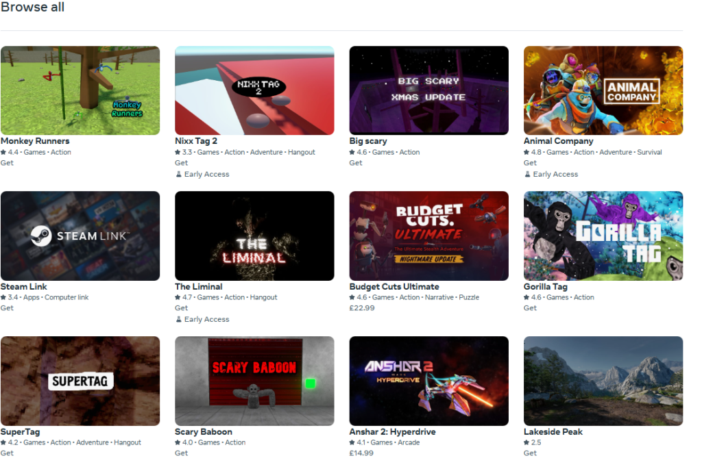 Nhưng không lâu sau, bạn sẽ đến với mục ‘Duyệt Tất Cả’, nơi các mục liệt kê thường có biến thể của các từ “Gorilla,” “Tag” hoặc “monkey.” Những ứng dụng này thường xếp hạng cao hơn cả Gorilla Tag do có đánh giá được thổi phồng từ một số lượng nhỏ người dùng. Nhiều người mà UploadVR đã nói chuyện đánh giá khả năng phát hiện (discoverability) của cửa hàng Quest hiện tại là kém, và thậm chí còn tệ hơn Steam. Một nhà phát triển đã so sánh nó với việc bước vào một cửa hàng bách hóa đầy quần áo rẻ tiền trong dịp lễ.